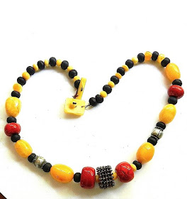 The necklace contains three antique Yemen silver beads, four of the Pacific coral beads and 27 bone beads.  The remainder of the beads, including the fastener are made of vintage amber resin beads.